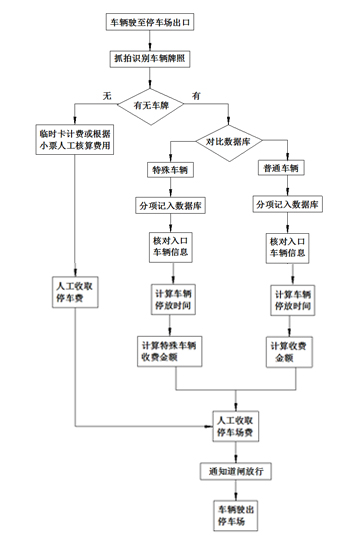 “出口系統”主要由ZQQM高清車牌識別設備、拍照補光設備、終端管理設備、數據傳輸設備及應用軟件等組成。主要作用為記錄出口車輛的全部信息、比對車輛數據庫車輛性質、比對入口車輛數據庫收取停車費、內部車輛的無障礙通行、無牌照車輛刷卡通行。