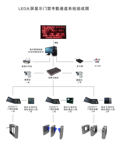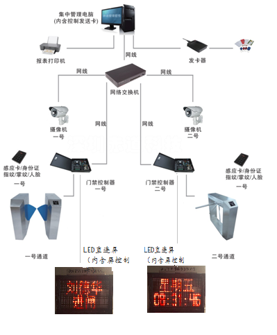 主要由計算機/打印機、智能讀卡器、智能控制器、攝像機、視頻服務器、智能閘機、智能卡及管理軟件等組成。采用TCP/IP網絡結構通訊,通訊距離可無限擴展,單臺計算機可接任意數(shù)量智能閘機。智能閘機,既可聯(lián)網運行,又可脫機運行。系統(tǒng)組成圖如下: